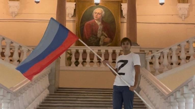 Антропов вышел на парадную лестницу в здании факультета в футболке с буквой Z и начал размахивать флагом «ЛНР».