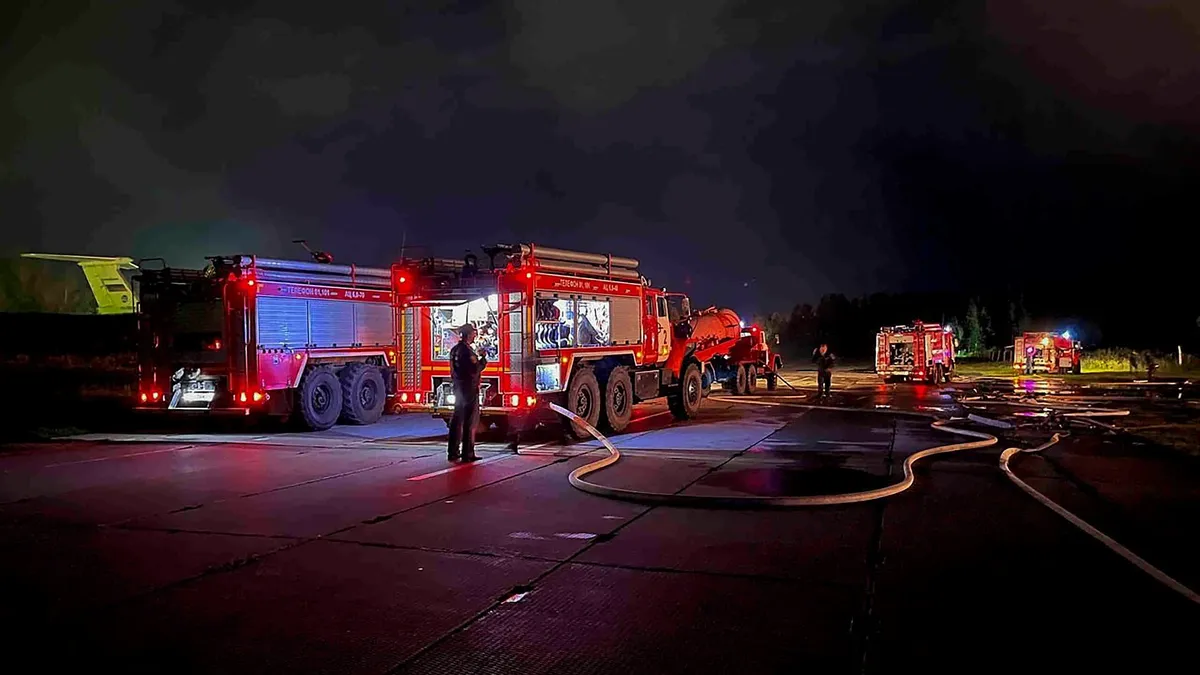 Пожарные машины возле псковского аэропорта ночью 30 августа. Фото: EPA-EFE / GOVERNOR OF PSKOV REGION