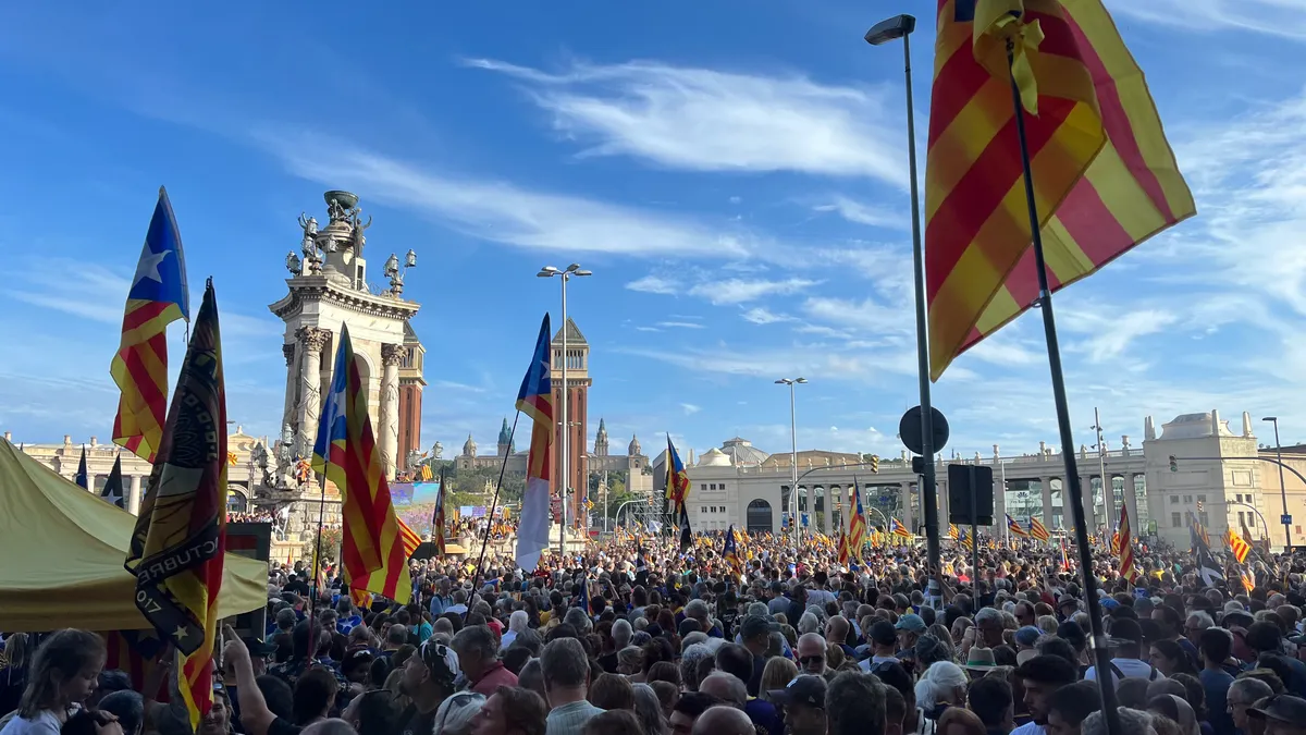 На привокзальной площади становится ясно, что собралось огромное количество людей: места, где заканчивается поток флагов, просто не видно. По данным сепаратистов, сегодня на улицы вышли 800 тысяч человек. Это число, конечно, серьезно завышено, но, даже по информации полиции, количество протестующих превысило 100 тысяч. Для сравнения, недавний митинг «юнионистов», на который в конце сентября в Мадрид съехались противники независимой Каталонии со всей страны, собрал 40 тысяч человек.