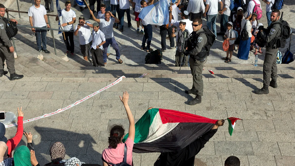 Палестинцы поднимают флаг, пока израильская пограничная полиция удерживает их и группу израильтян правого толка во время марша к Западной стене в День Иерусалима, 28 мая 2014 года. Фото: Jim Hollander / EPA