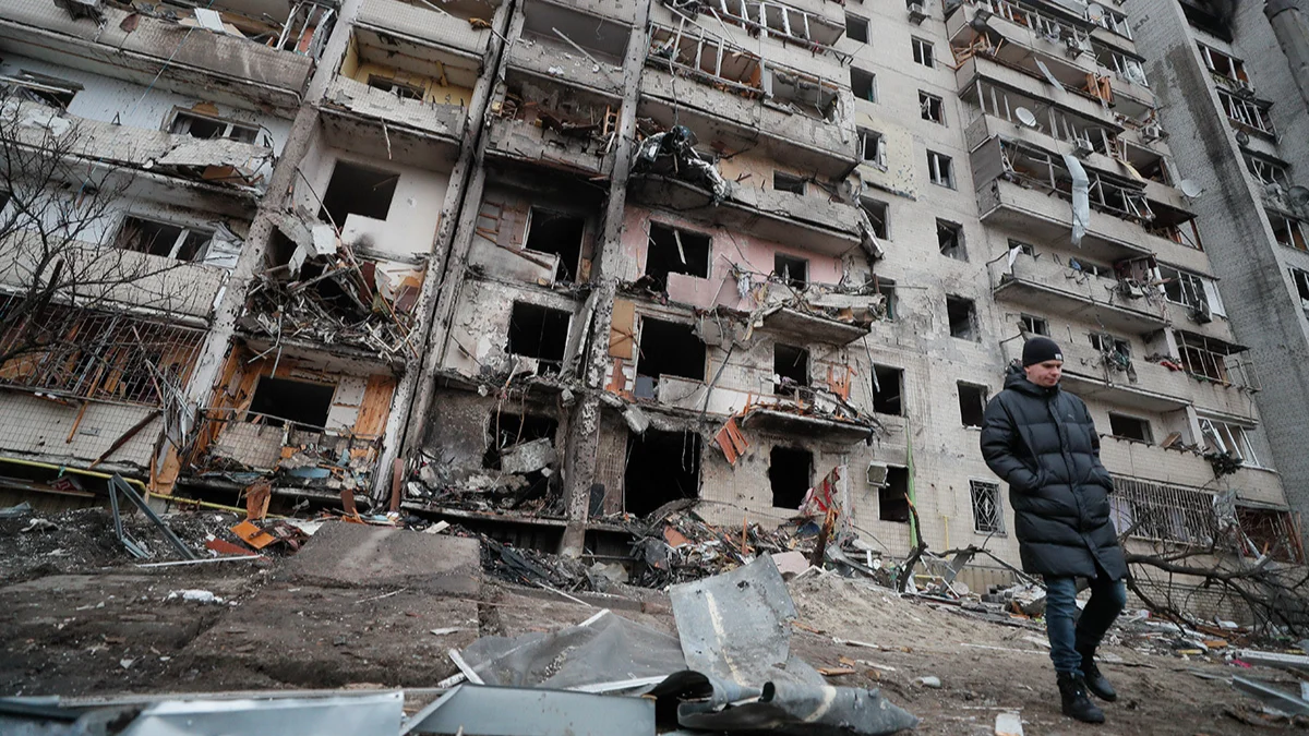 Последствия ночного обстрела жилого района в Киеве, Украина, 25 февраля 2022 года. Фото: Сергей Долженко / EPA-EFE