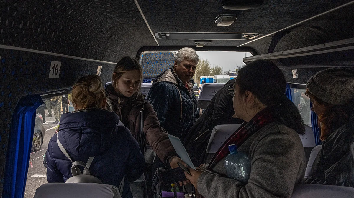 Эвакуированные из Мелитополя в микроавтобусе вместе с другими людьми, бежавшими из оккупированных российскими военными районов на юге Украины, прибывают в пункт эвакуации в Запорожье, Украина, 21 апреля 2022 года. Фото: Роман Пилипей/EPA-EFE