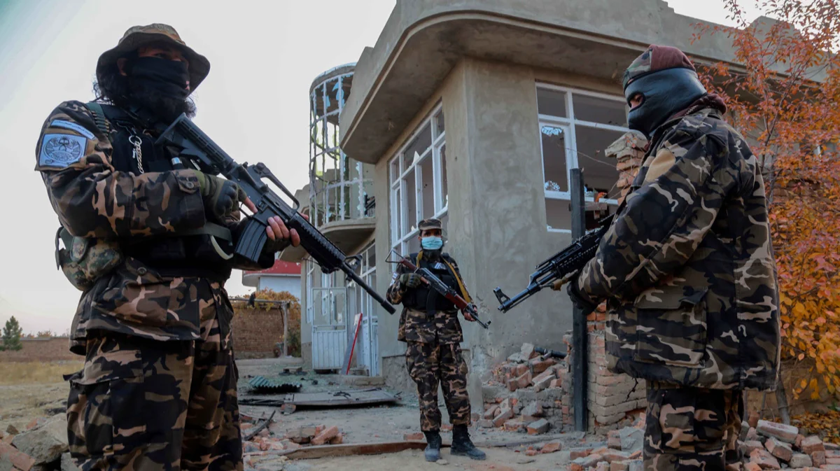 Талибы осматривают место проведения операции против боевиков ИГИЛа на окраине Кабула, Афганистан, 18 ноября 2021 года. Фото: Stringer / EPA-EFE
