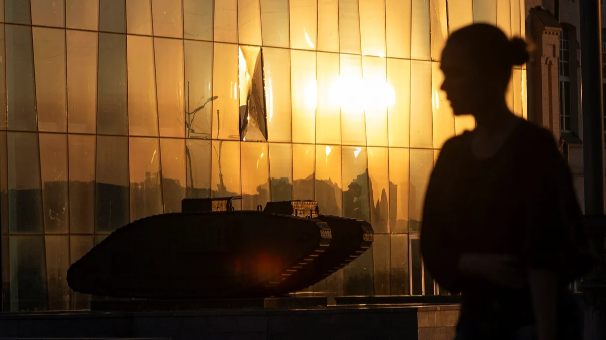 Британский танк Mark V времен Первой мировой войны около поврежденного фасада исторического музея на площади Конституции в центре Харькова, Украина, 27 мая 2024 года. Фото: Валентин Огиренко / Reuters / Scanpix / LETA