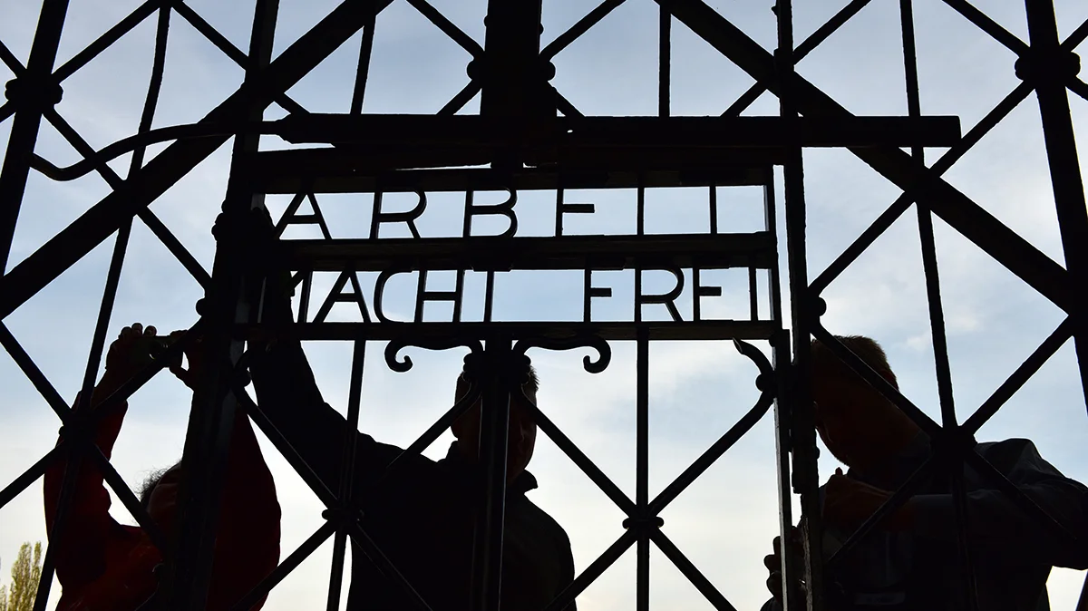 Надпись Arbeit macht Frei (с нем. Работа делает тебя свободным) на мемориале концлагеря Дахау, Германия, 29 апреля 2015 года. Фото: Peter Kneffel / EPA