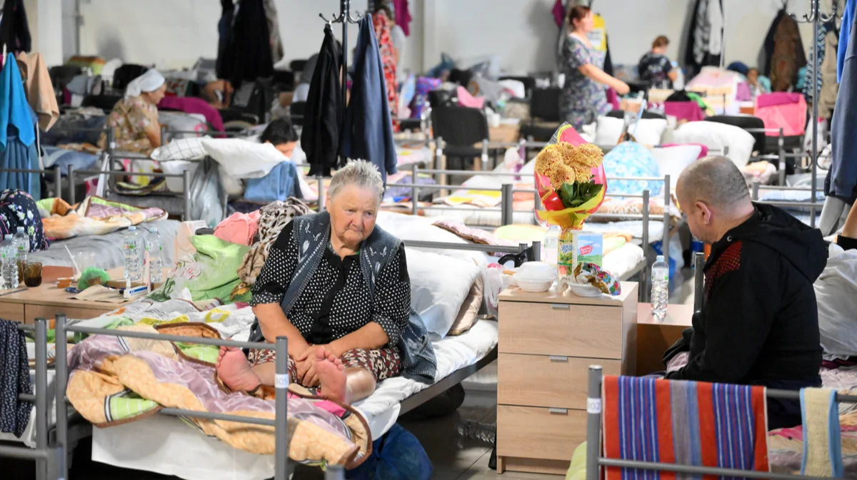 Беженцы из пограничных с Украиной районов в пункте временного размещения в бывшем торговом центре, Железногорск, Курская область, 26 августа 2024 года. Фото: Илья Питалев / Спутник / Imago Images / SNA / Scanpix / LETA