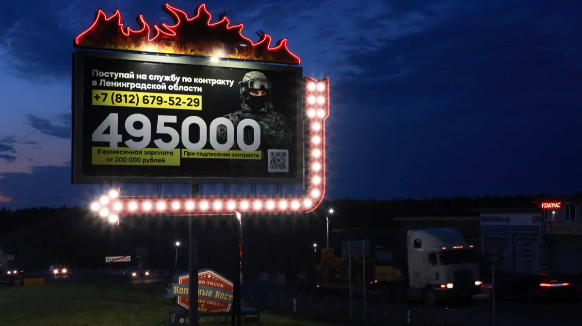 Билборд с рекламой воинской службы по контракту в Ленинградской области, июль 2023 года. Фото: Антон Ваганов / Reuters / Scanpix / LETA