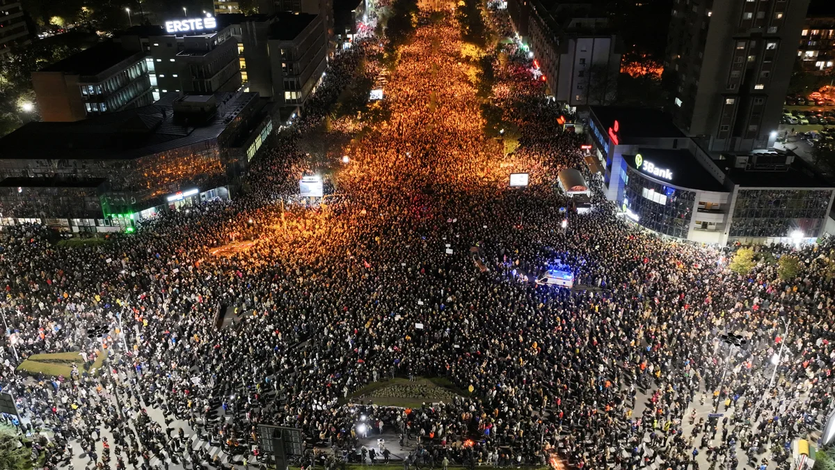 Вид с высоты на акцию протеста напротив железнодорожного вокзала в Нови Сад, 5 ноября 2024 года. Фото: Fedja Grulovic / Reuters / Scanpix / LETA