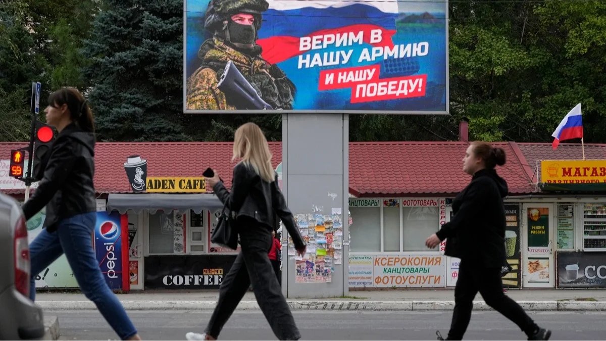 Люди проходят мимо баннера с изображением военнослужащего и флага России в Луганске, Луганская область, Украина, 27 сентября 2022 года. Фото: AP Photo / Scanpix / LETA