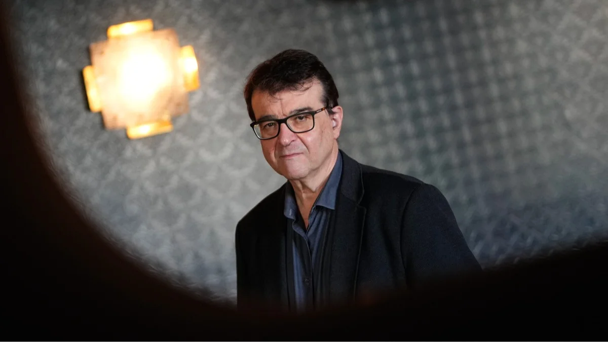 Писатель Хавьер Серкас на фоне обложки романа «Солдаты Саламина», Мадрид, Испания, 26 февраля 2026 года. Фото: Borja Sanchez-Trillo / EPA