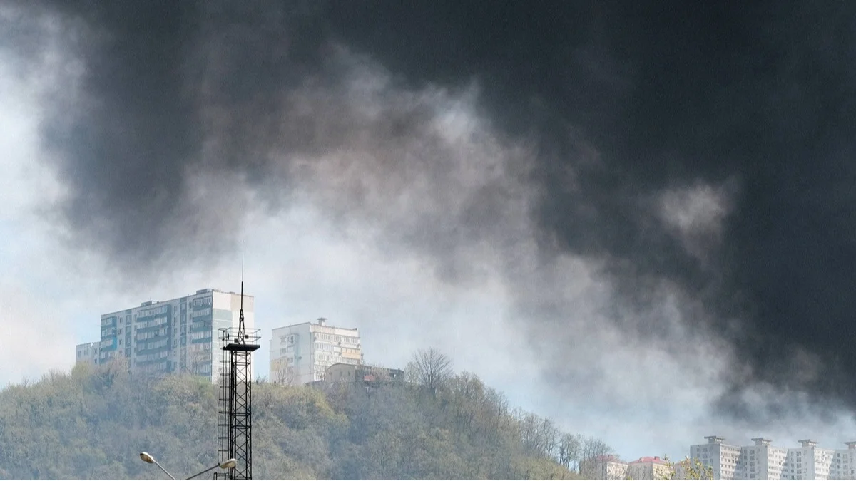 Жилые дома в дыму от пожара на нефтебазе в Туапсе после атаки беспилотников, Краснодарский край, 21 апреля 2026 года. Фото: Борис Морозов / Спутник / Imago Images / Scanpix / LETA
