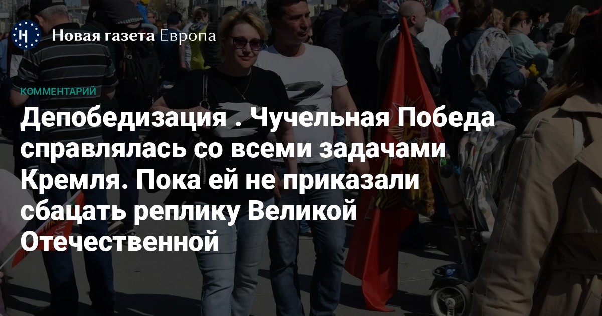Власть выжимала из Победы все; когда один скоморох выдыхался, его из чучельной шкуры вытряхивали и зашивали туда следующего, а прочие стояли кругом и идей набрасывали — что еще этакого может исполнить выпотрошенное божество. Оно получалось как бы дрессированное, оно любые трюки умело. Ему поручали волшебство с выборами, ему поручали за Крым пояснять, ему поручали и далекую Сирию жечь, и оппозицию дома кушать, и со всем чучельная Победа справлялась. Пока ей не приказали сбацать реплику Великой отечественной.