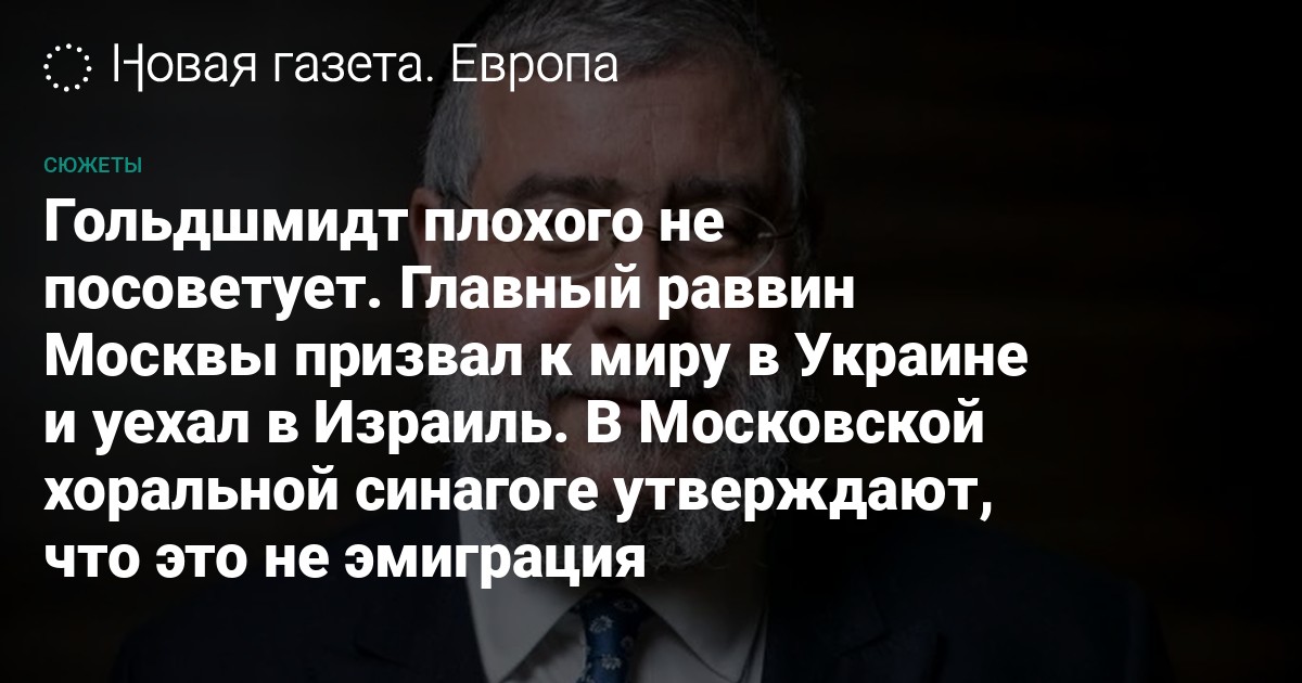 Главного раввина Москвы, председателя Раввинского суда России и СНГ Пинхаса Гольдшмидта «вынудили уехать из России за отказ поддержать [Роскомнадзор] с Украиной». Такие сенсационные заголовки украсили 8 июня ленты украинских и российских (неправительственных) СМИ. Первоисточником стала авторитетная The Jerusalem Post, которая, в свою очередь, процитировала твит невестки главного раввина Авиталь Чижик-Гольдшмидт. Она написала, что «может окончательно заявить»: ее свекор и свекровь «подверглись давлению властей, требовавших публично поддержать «спецоперацию» в Украине, — и уехали» из России. Газета уточняла, что раввинская чета в начале марта отправилась в Венгрию, где помогала беженцам, а затем прибыла в Израиль, где ухаживает за тяжело больным отцом Пинхаса Гольдшмидта.