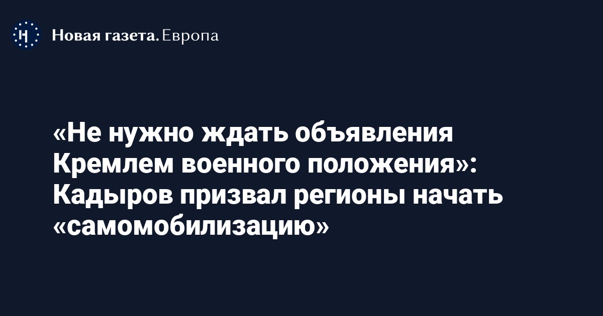 Глава Чечни Рамзан Кадыров призвал регионы начать «самомобилизацию» и не ждать объявления Кремлем военного положения. Соответствующее сообщение он опубликовал в своем телеграм-канале.