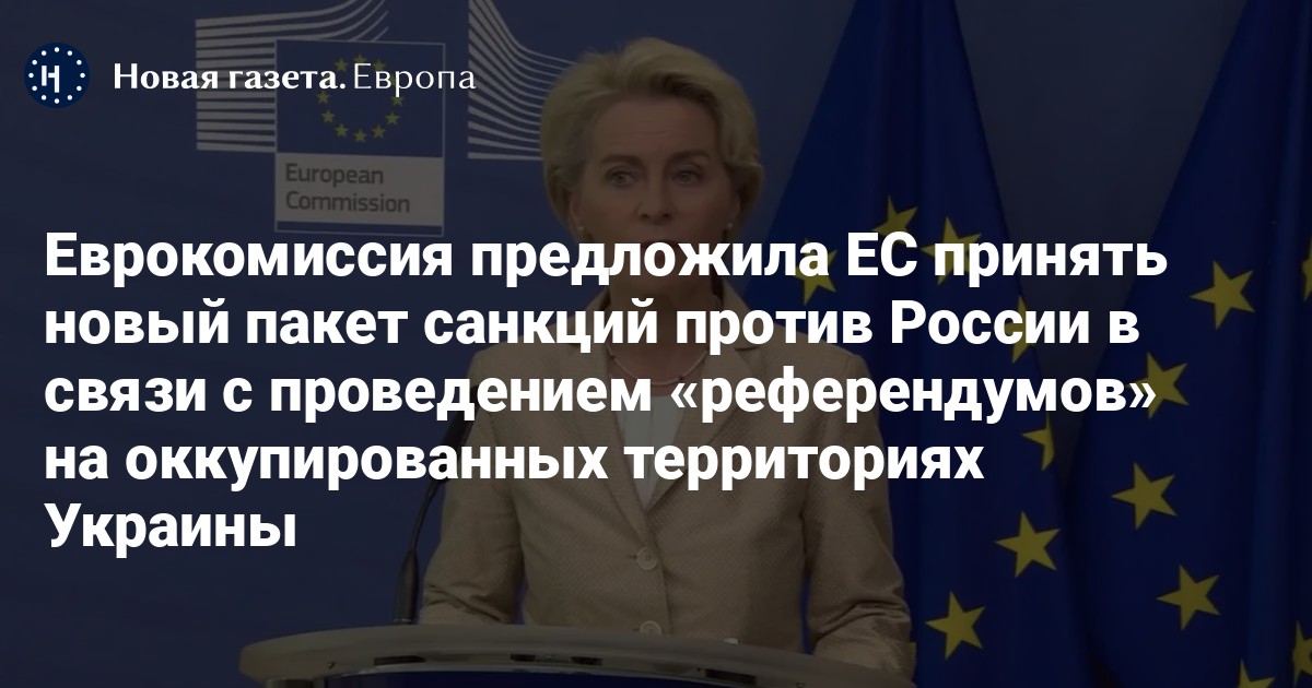 Еврокомиссия предложила Евросоюзу принять новый пакет санкций против России в связи с проведением «референдумов» на оккупированных территориях Украины. Об этом сообщила глава Еврокомиссии Урсула фон дер Ляйен в твиттере.