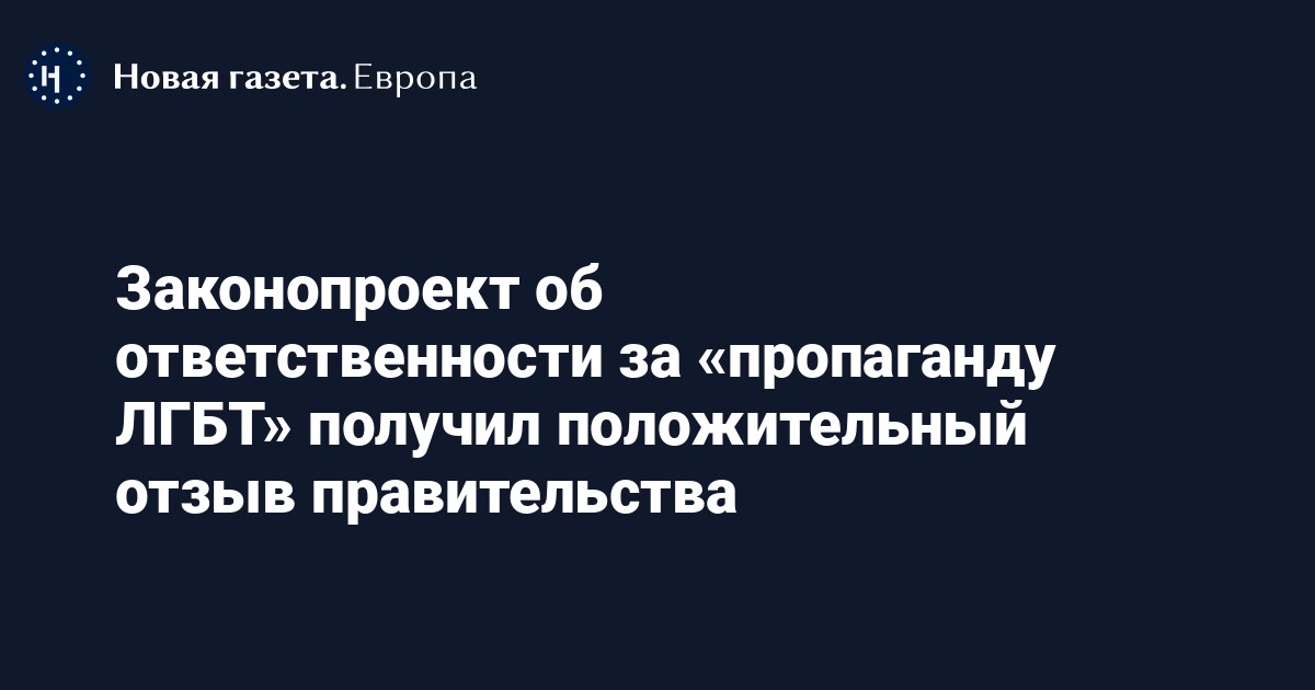Правительство РФ дало положительный отзыв на законопроект об ответственности за «пропаганду ЛГБТ». Об этом заявил автор инициативы, глава комитета Госдумы по информационной политике Александр Хинштейн.