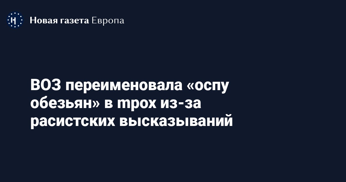 «ВОЗ начнет использовать новый предпочтительный термин «mpox» в качестве синонима оспы обезьян. Оба названия будут использоваться одновременно в течение одного года, пока «оспа обезьян» будет постепенно выводиться из употребления», — решили в организации.