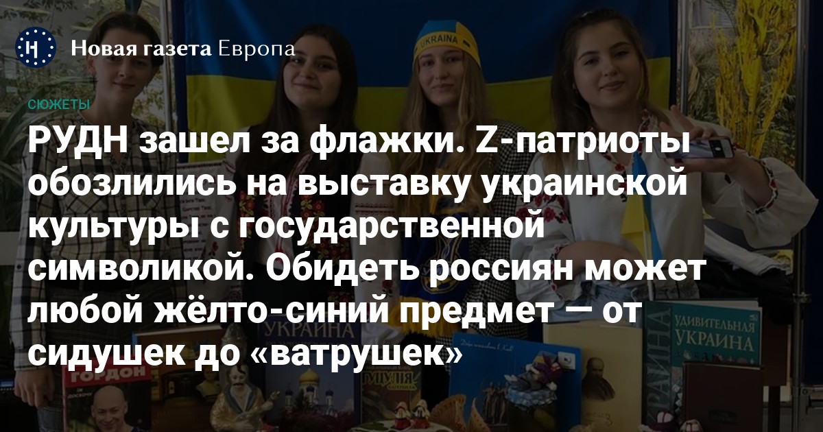 Минобрнауки назначило служебную проверку в Российском университете дружбы народов, где несколько дней назад прошла украинская выставка. Сине-желтые флаги возмутили провластную публику, Z-патриоты заполонили страницы вуза в соцсетях с призывами к увольнениям педагогов и руководства. Но это не единственное такое проявление агрессии по отношению к украинской символике и всему, что ее напоминает. Пока российские власти борются с «отменой русской культуры» на Западе, в России планомерно на протяжении года уничтожают все украинское. Подробнее об этом — в материале «Новой газеты Европа».
