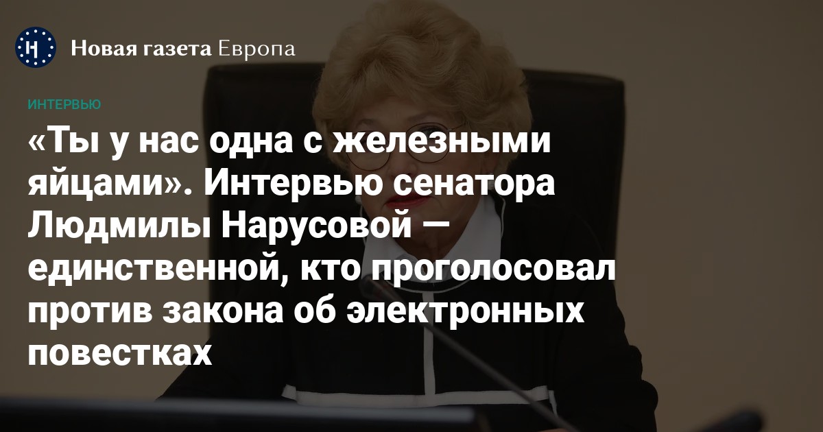 Из 170 членов Совета Федерации, утверждавших закон «об электронных повестках», против выступила только сенатор от Тывы Людмила Нарусова: «Давайте не будем лукавить», — предложила она коллегам. Те захотели лишить ее права выступать, а потом предложили «выпить чаю».