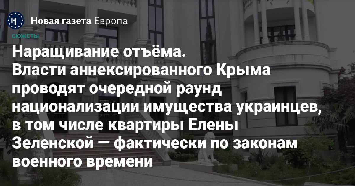 Чем хуже идут дела у России на фронте и международной арене, тем активней крымские власти попирают Конституцию (про украинскую и речи нет, но даже и российскую). На этот раз речь не о свободе слова и собраний, — а о прогремевшей национализации имущества украинских граждан на территории аннексированного полуострова. Крымские власти используют эту тему еще и как инструмент пропаганды, хвастаясь перед кремлевским начальством борьбой с «укронацистами в тылу». Одна из самых обсуждаемых тем последнего времени — национализация квартиры жены украинского президента Елены Зеленской (раньше — для солидности — провластные СМИ называли эту недвижимость «квартирой Зеленского»).