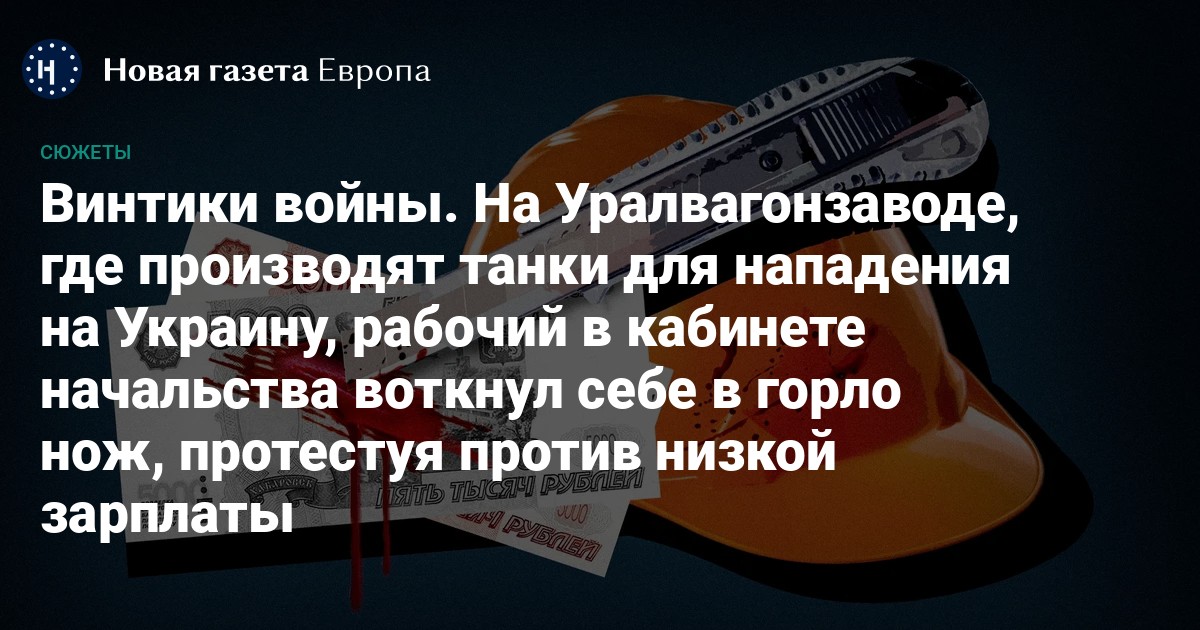 — Начальник цеха ему на это заявил: «Не нравится — увольняйся», — рассказал «Новой газете Европа» Павел Сергиеня, исполнительный директор независимого профсоюза «Солидарность» в Нижнем Тагиле (он не скрывает своего имени, потому что сам уже не работает на УВЗ, наоборот, судится с ним в связи с нарушением прав рабочих, членов профсоюза. — Прим. ред.). — После этого Павел М. воткнул себе в горло канцелярский нож.
