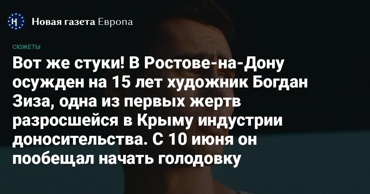 В Ростове-на-Дону осужден на 15 лет художник Богдан Зиза, одна из первых жертв разросшейся в Крыму индустрии доносительства. С 10 июня он пообещал начать голодовку