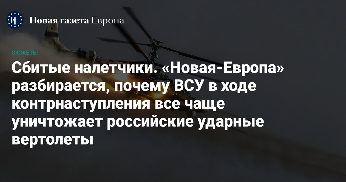 «В последнее время Россия стала всё чаще применять вертолеты, — рассказывает «Новой-Европа» военный обозреватель Русской службы Би-би-си Павел Аксёнов. — На одном из ресурсов, где выкладываются видеозаписи применения авиации, именно с начала украинского наступления резко увеличилось число роликов с использованием российских ударных вертолетов. Если раньше на видео, которые появлялись в соцсетях, они чаще стреляли с кабрирования (Кабрированием называется полет самолета или вертолета с набором высоты и задранным выше горизонта носом, — Прим. ред.) в сторону неприятеля НУРСами, то теперь, судя по открытым источникам, «вертушки» больше применяются для борьбы с бронетехникой. Для этого они задействуют противотанковые ракеты. На предельной дистанции ракета «Вихрь», например, летит до 30 секунд. Все это время вертолет должен удерживать лазерную метку на цели, чтобы обеспечить целеуказание для ПТУР. Для этого лучше всего зависнуть. Это делает вертолет потенциально более уязвимым для ударов с земли».