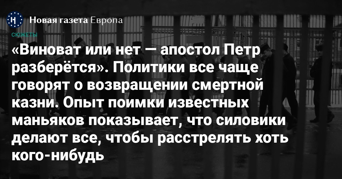 В 90-х годах прошлого столетия наша страна начала двигаться в направлении такого положения дел, когда во главу угла ставится не звонок чиновника, указывающего, какой нужно вынести приговор, а презумпция невиновности, состязательность судебного процесса, оперирование фактами, а не домыслами и предположениями. Этот путь мог привести к открытости общественных процессов и соблюдению законности. Но в какой-то момент процесс повернулся вспять. В настоящее время добиться справедливого следствия и беспристрастного суда намного труднее, чем даже в СССР. Во времена социализма за правоохранительными органами худо-бедно, но присматривали партийные структуры, не давая скатиться в откровенный беспредел и беззаконие. У нынешней российской правоохранительной системы нет ни контроля, ни каких бы то ни было сдерживающих факторов. В таких условиях возобновление исполнения смертных приговоров можно сравнить с геноцидом российского народа со стороны тех, кто стоит у власти.
