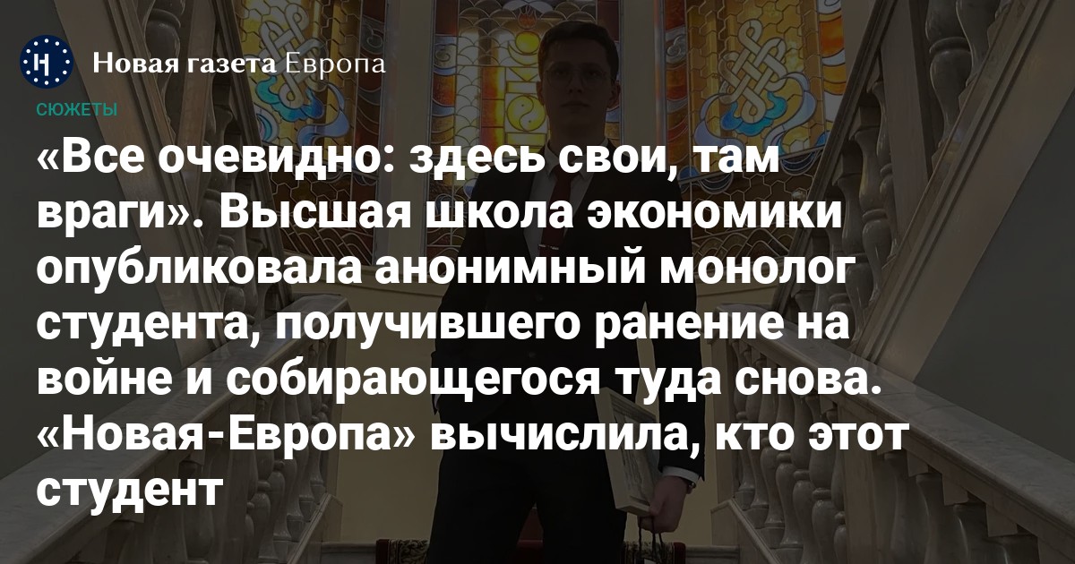 «Новая газета Европа» выяснила, что автор этого монолога — вероятнее всего, студент третьего курса образовательной программы «Монголия и Тибет» Максим Гула. Он был членом студсовета Факультета гуманитарных наук, а также занимался волонтерством — «Новая-Европа» выяснила, что в марте 2023 года он ездил в Мариуполь в качестве волонтера от РПЦ. Также Гула участвовал в создании студенческой организации «Вышка — детям», которая проводит культурный и образовательный досуг для школьников.