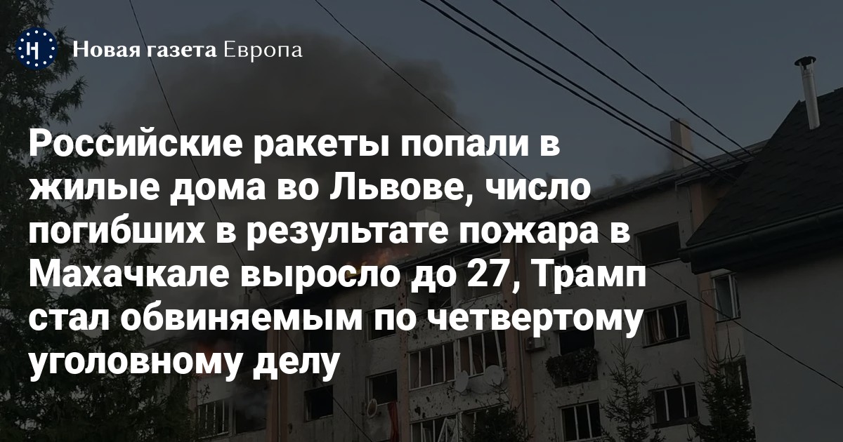 Российские ракеты попали в жилые дома во Львове, число погибших в результате пожара в Махачкале выросло до 27, Трамп стал обвиняемым по четвертому уголовному делу