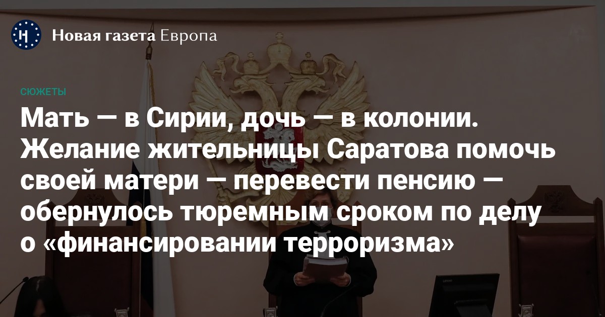 В 2021 году суд в Саратове приговорил местную жительницу Гульчехру Решетникову к 10 годам колонии по обвинению в финансировании незаконного вооруженного формирования (НВФ) из-за перевода пенсии матери в Сирию. Российские спецслужбы посчитали, что эти средства пошли на деятельность террористической организации. Осужденная не признала вину и утверждает, что перечисляла средства с пенсионного счета матери на ее личные нужды. Защита Решетниковой подала жалобу в Верховный суд РФ на приговор и требует ее полностью оправдать, поскольку в действиях подзащитной нет состава преступления. По их мнению, суд проигнорировал довод о том, что разовое перечисление матери собственных средств не может признаваться финансированием вооруженного формирования.