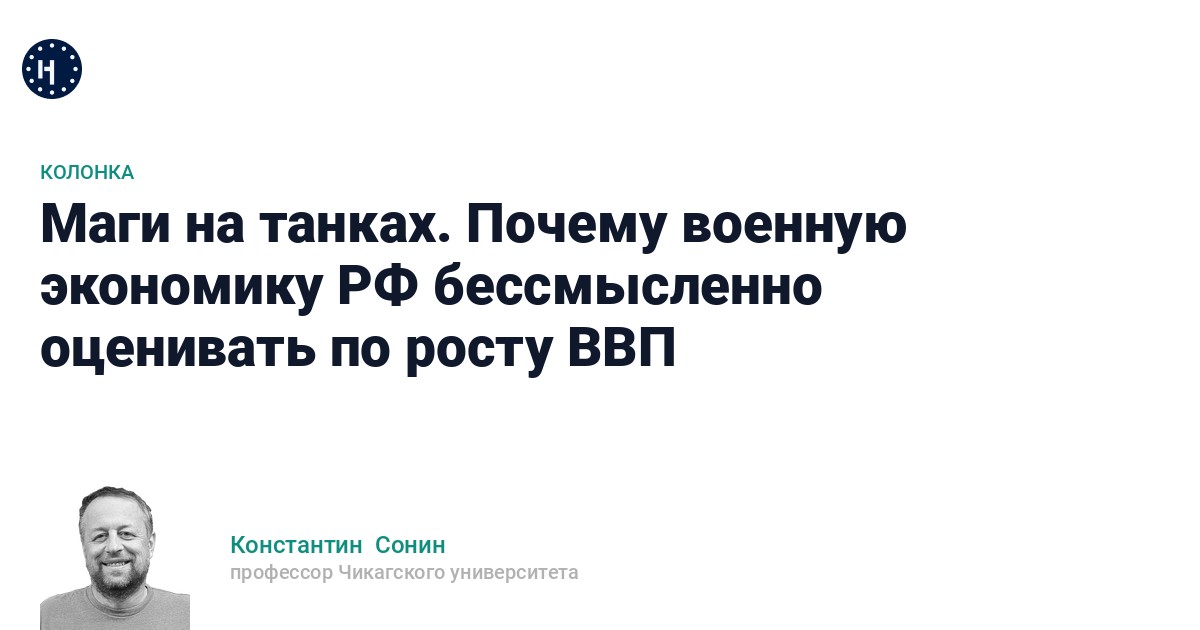 «Рост ВВП», который сейчас обсуждается экспертами, — это статистическая фикция, состоящая из двух компонентов. Во-первых, ВВП и ВВП на душу населения ценны и важны как экономические индикаторы не сами по себе, а потому что они, если усреднять за несколько лет, очень сильно коррелируют с остальными показателями качества жизни: с ее продолжительностью, количеством свободного времени и времени, проведенного с детьми, с занятиями спортом, путешествиями, просмотрами сериалов, частотой смены машин, гаджетов, одежды и т. п. В нормальных обстоятельствах рост ВВП на душу населения (показатель, сам по себе не имеющий значения) одновременно показывает, насколько вырос уровень жизни (тот показатель, которым мы реально интересуемся, говоря об экономике). В военное время эти показатели расходятся: ВВП может расти, а уровень жизни — нет. Потому что произведенные танки, которые сгорают под Авдеевкой в Украине, или ракеты, которыми обстреливают украинские города, в ВВП появляются, а уровень жизни россиян не улучшают.