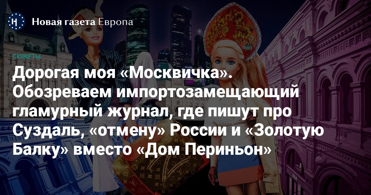 Но вот в ноябре 2023-го свершилось. «Постсанкционный глянец», «новый глянец», «кремлевский глянец», «русский Tatler» — так медиа описывали журнал «Москвичка», запуск которого с одобрения администрации президента приготовили бывшие комиссары движения «Наши» (по данным «Важных историй», предлагая потенциальным сотрудникам издания «любую зарплату»). Специально для «Новой газеты Европа» Андрей Сапожников разбирался, что представляет собой «Москвичка» с идеологической точки зрения, при чем здесь мифотворчество, старый путинский гламур, новая русская буржуазия и Лени Рифеншталь.