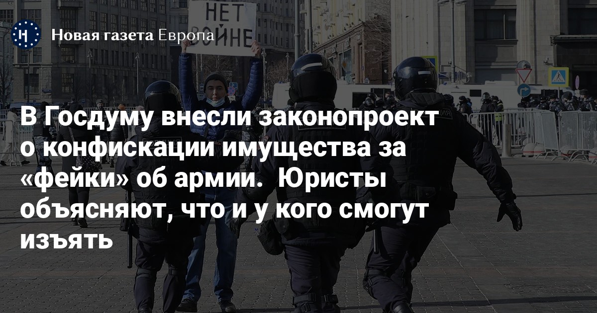 22 января в Государственную думу внесли законопроект о конфискации имущества у осужденных по статьям о «дискредитации» армии, призывах к терроризму и введению санкций. Депутаты планируют, что средства и имущества могут быть изъяты у тех, кто совершил преступлениях «из корыстных побуждений».