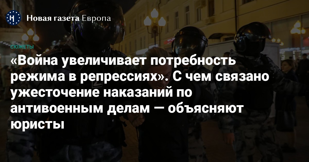 «Новая газета Европа» обсудила с юристами эту тенденцию военного времени — ужесточение сроков лишения свободы практически по всем категориям дел, идущее вразрез с закрепленным в законодательстве принципом об экономии уголовной репрессии и исправлении осужденных.