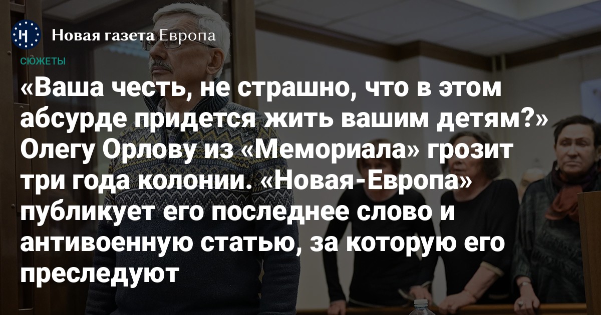 «Новая газета Европа» полностью публикует и последнее слово Орлова, сказанное в Головинском суде Москвы, и его антивоенную статью.
