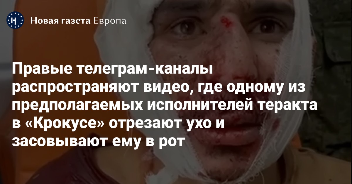 Телеграм-канал, который СМИ связывали с ЧВК «Вагнера», опубликовал видео, где мужчины в камуфляжной форме отрезают ухо мужчине. Это может быть человек, которого российские власти поймали в лесу под Брянской областью и считают исполнителем теракта в концертном зале «Крокус Сити Холл». Одежда этого человека и характер травм может говорить о том, что ухо отрезали при задержании. Ранее каналы связанные с силовиками и кремлёвские СМИ публиковали видео допроса мужчины в такой же одежде и с огромным ранением в области правого уха.