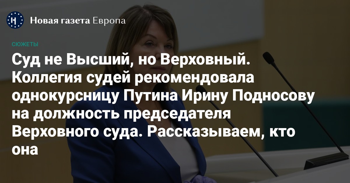 23 февраля ушел из жизни председатель Верховного Суда России Вячеслав Лебедев, занимавший эту должность с 1989-го года. Среди основных кандидатов на пост называют Дмитрия Медведева и бывшую сокурсницу Владимира Путина Ирину Подносову. «Новая газета Европа» поговорила с теми, кто лично знает претендентку на высокий пост.
