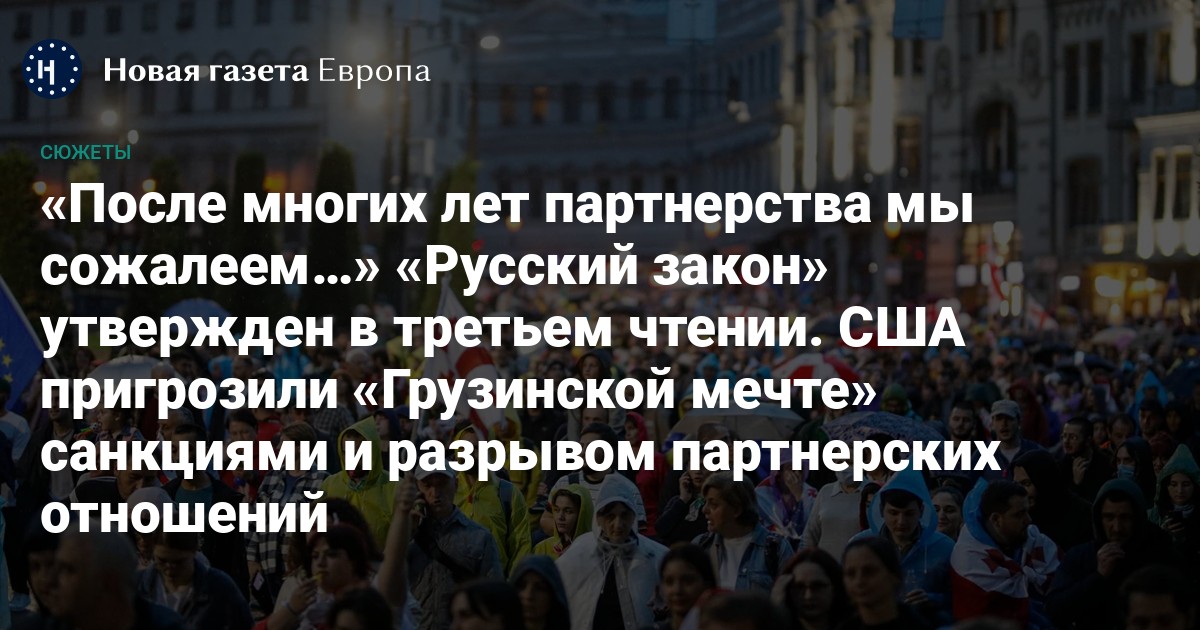 «Грузинская мечта» не отказалась от планов принять «русский» закон об иноагентах, несмотря на состоявшуюся в субботу беспрецедентную в истории современной Грузии акцию протеста. Не намерены отступать и те, кто против закона. Ни президент, ни участники непрекращающейся акции не верят обещаниям правящей партии пойти на уступки после окончательного принятия закона. Возможно, на ситуацию повлияет посланник из США, который был направлен в Тбилиси после шокировавших Вашингтон заявлений грузинского премьера, обвинившего Америку в подготовке переворота. Но если дипломатия не сработает, Грузию может ждать серьезный разрыв с Западом: в Конгрессе уже грозятся обращаться с Иванишвили, как с Лукашенко.