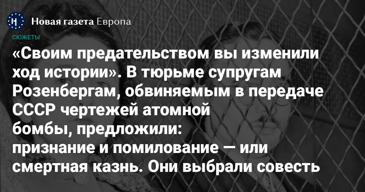 В тюрьме супругам Розенбергам, обвиняемым в передаче CCCР чертежей атомной бомбы, предложили: признание и помилование — или смертная казнь. Они выбрали совесть
