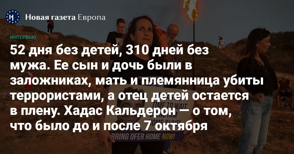 Еще 6 октября прошлого года никто, кроме ее близких и жителей ее родного кибуца, не знал, кто такая Хадас Кальдерон. Сегодня же в Израиле и далеко за его пределами ее знают миллионы людей. Хадас мечтала бы о том, чтоб оставаться, как и прежде, никому не известной, и жить своей тихой райской, по ее выражению, жизнью в маленьком кибуце Нир Оз на юге Израиля, но 7 октября жизнь целой страны и ее жизнь, в частности, превратились в настоящий ад. Мать и племянница Хадас были жестоко убиты, а двое ее детей — Эрез и Саар — вместе с их отцом Офером были взяты в плен. Офера держат в плену по сей день, а дочь и сын вернулись в Израиль в результате сделки, после того как 52 два дня находились в заложниках у террористов. 52 дня ада для них и их матери.