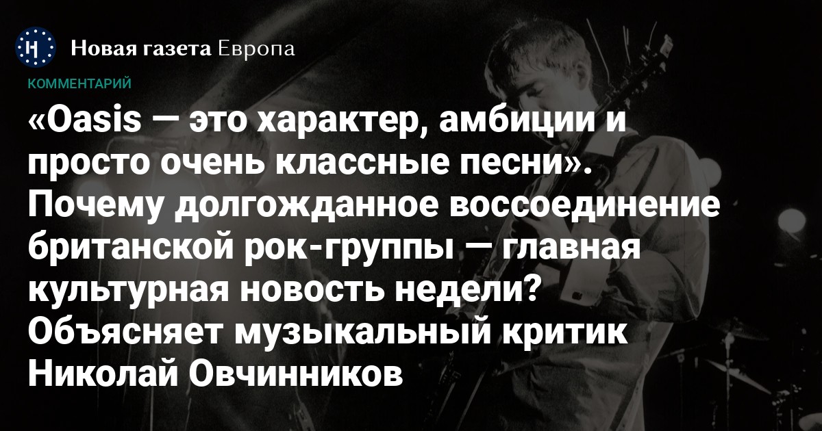 «Новая газета Европа» спросила у журналиста Николая Овчинникова (телеграм-канал «Войс»), почему воссоединение авторов вечных хитов «Wonderwall» и «Don’t look back in anger» стало новостью номер один в мире музыки.