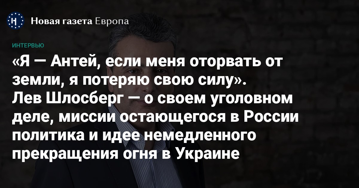 Зампред партии «ЯБЛОКО» Лев Шлосберг — один из немногих российских оппозиционеров, не уехавших из страны после начала войны в Украине. Он сразу же осудил действия России, но делает это аккуратно, подчиняясь требованиям российской военной цензуры. Шлосберг призывает остановить бойню и немедленно заключить перемирие, а решать, кто будет владеть Крымом или Мелитополем, предлагает потом. После вторжения ВСУ в Курскую область Шлосберг опубликовал несколько постов с критикой российских оппозиционеров в изгнании, которых записал в «партию чужой крови». Умеренная позиция не уберегла его от внимания силовиков: 2 октября на него завели уголовное дело за «неисполнение обязанностей иноагента». В интервью журналисту Илье Азару специально для «Новой газеты Казахстан» Шлосберг объяснил, почему только тот, кто не уехал за рубеж, может называть себя российским политиком, и сравнил себя с героем древнегреческих мифов Антеем, который черпал свою силу от соприкосновения с землей, но был убит поднявшим его в воздух Гераклом.