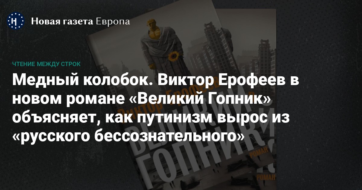 В лейпцигском русскоязычном издательстве ISIA Media Verlag вышла новая книга Виктора Ерофеева «Великий Гопник», изначально опубликованная в немецком переводе. В ней писатель ищет истоки путинизма в питерской подворотне и в глубинах русского бессознательного, размышляет о реальном и мифическом «президенте», сталинизме, причинах нового витка российского тоталитаризма и украинской войны. Сорин Брут рассказывает об актуальном и во всех смыслах большом романе.