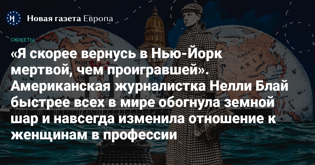 135 лет назад, 14 ноября 1889 года, 25-летняя корреспондентка газеты New York World Нелли Блай поднялась на борт новенького океанского лайнера «Августа Виктория». Вслед за героем Жюля Верна Филеасом Фоггом ей предстояло обогнуть земной шар за 80 дней и написать об этом серию очерков. Блай не только справилась с заданием, в одиночку преодолев больше 40 000 км, опередив Фогга на неделю и вернувшись из поездки мировой знаменитостью. Она в немалой степени изменила отношение к женщинам в журналистике и в обществе в целом.