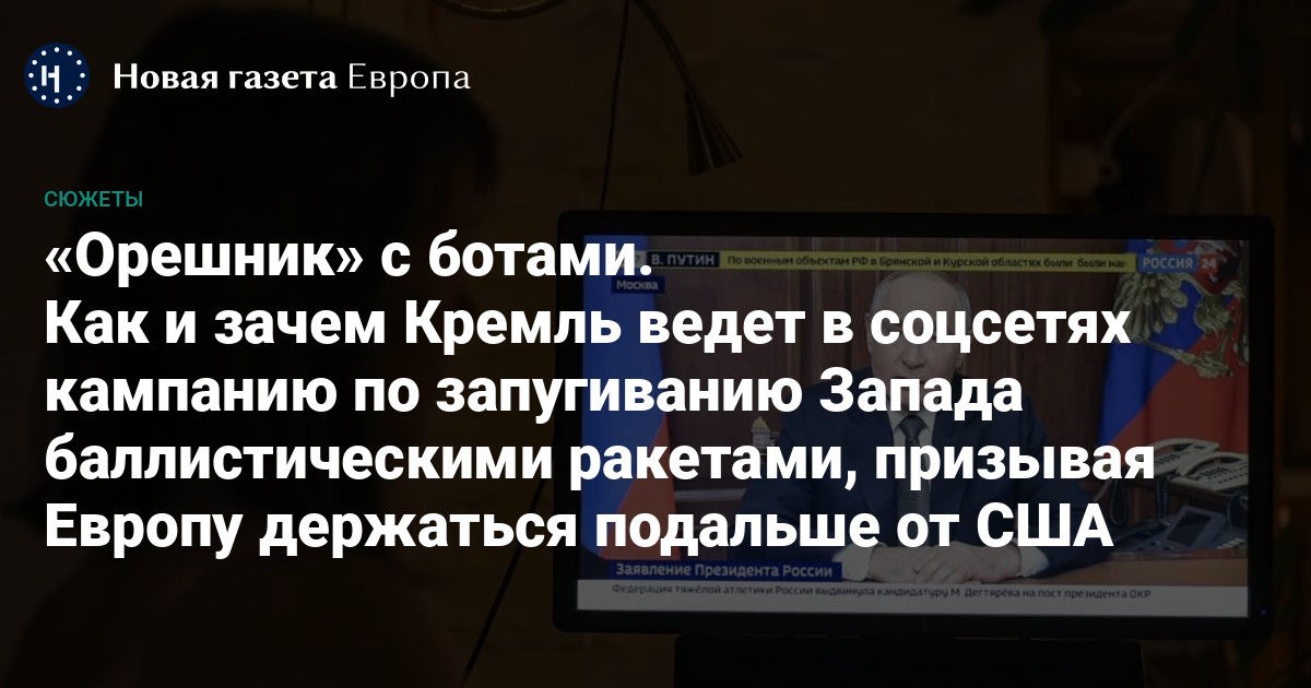 У ботов двух кремлевских сетей, нацеленных на Запад, уже третий день идет кампания запугивания западных стран баллистическими ракетами «Орешник». Именно ими Россия нанесла удар по заводу «Южмаш» в Днепре, ответив на разрешение Украине бить по территории РФ ракетами большой дальности.