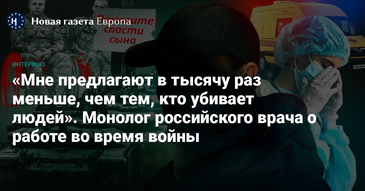 Я всю жизнь хотела лечить людей, чтобы они были здоровы. И в один момент моё государство сказало: «Ну, слушай, мало ли что ты хочешь». И когда ты в определенный момент чувствуешь, что в этом обществе [лечить людей] не надо, в этом обществе надо убивать других людей, и это поощряется… Когда ты понимаешь, что вот ты врач, ты учился, всё супер, но тебе нечем лечить, потому что твое государство решило, что деньги на танки важнее, чем деньги на препараты от тромбозов, — ну, простите.