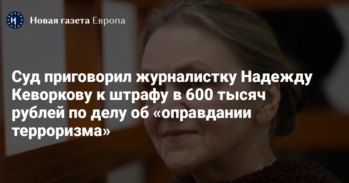 Второй западный окружной военный суд приговорил журналистку и писательницу Надежду Кеворкову к штрафу в размере 600 тысяч рублей по делу об «оправдании терроризма» (ч. 2 ст. 205.2 УК). Об этом сообщает «Медиазона».