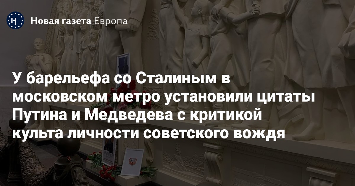 У барельефа со Сталиным в московском метро установили цитаты Путина и Медведева с критикой культа личности советского вождя
