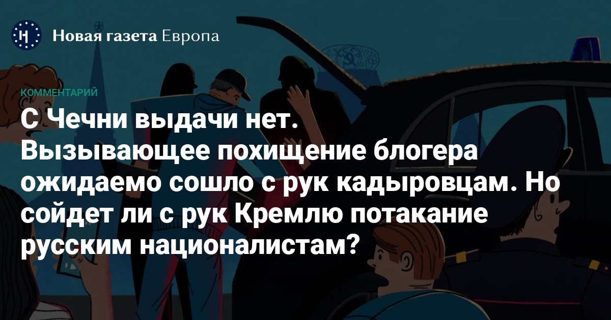 По данным «Новой газеты Европа», похитители блогера Арега Щепихина с прошедшей субботы, 7 июня, находятся в Чечне. По словам нашего источника в окружении депутата Госдумы от Чечни Адама Делимханова, «вопрос с их уголовным преследованием был урегулирован».